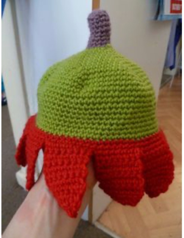 Block the petals and then sew the tips of three of them to the body of the beanie so they don’t get in the baby’s eyes.