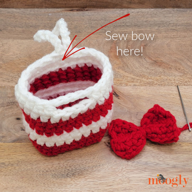 Fold center of bow into Z shape, and use long tails to wrap around center and secure. Sew to Rnd 16 on inside of bag, opposite the ch-4 opening (see image below).